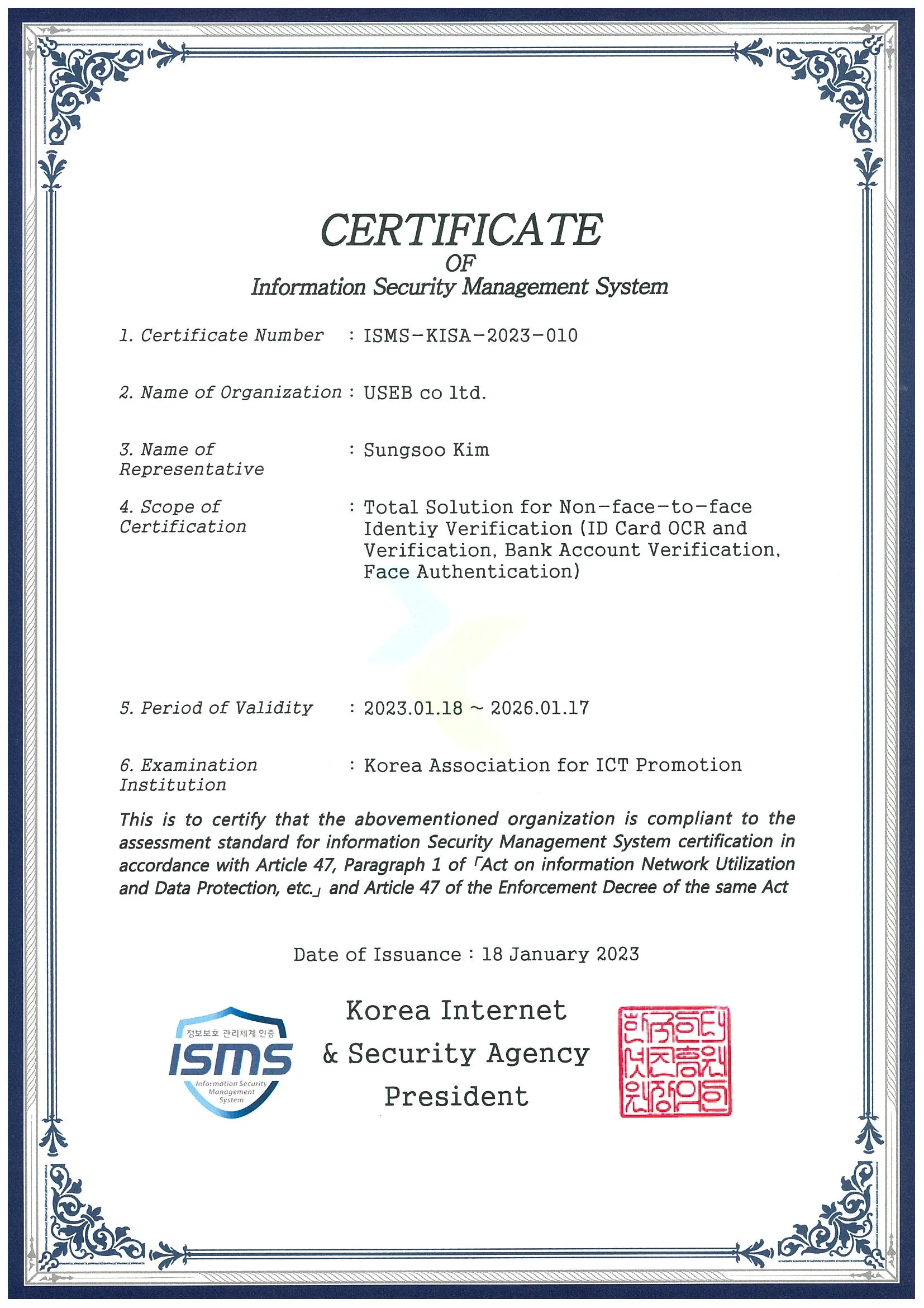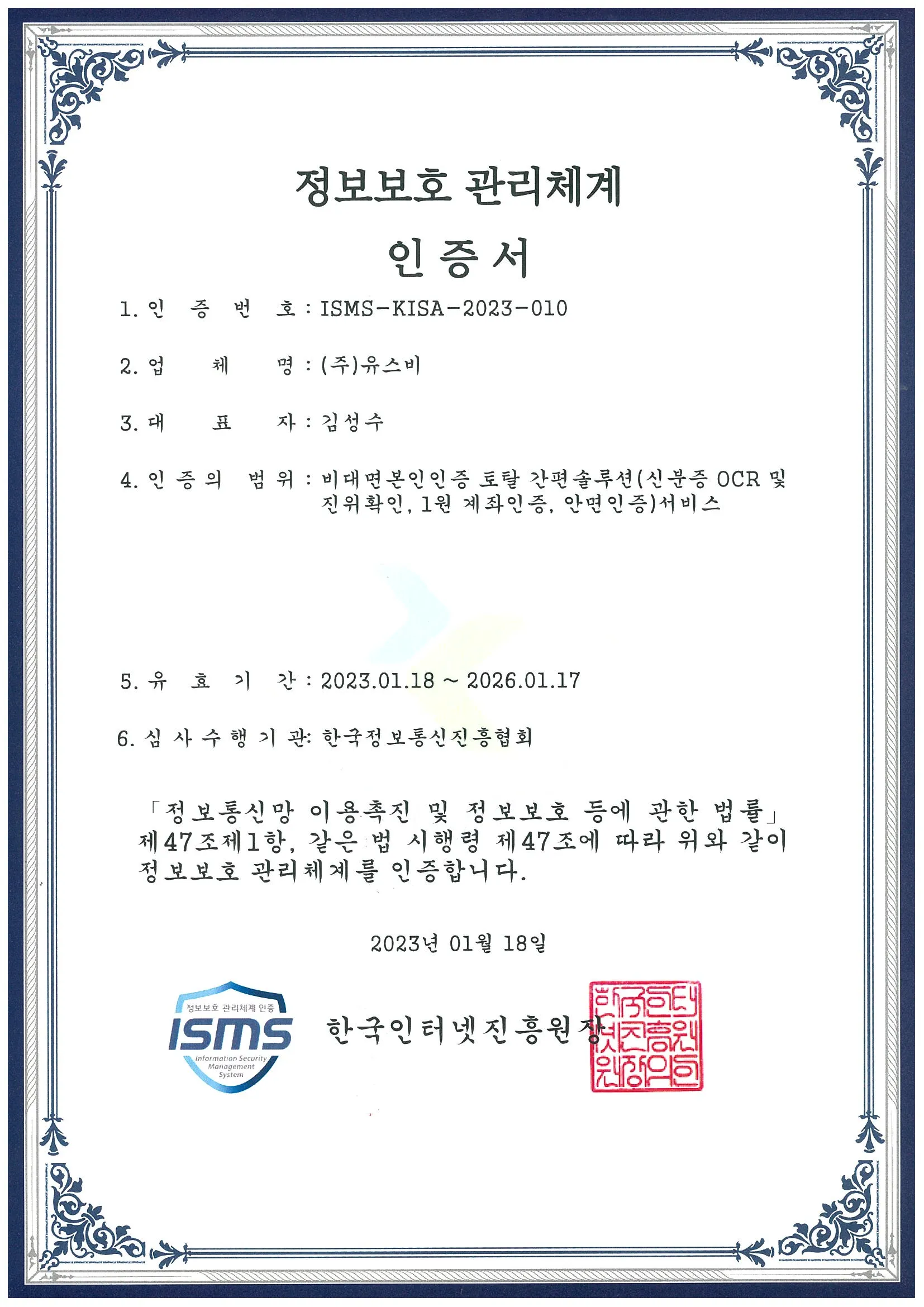유스비가 인정받은 ISMS 인증서