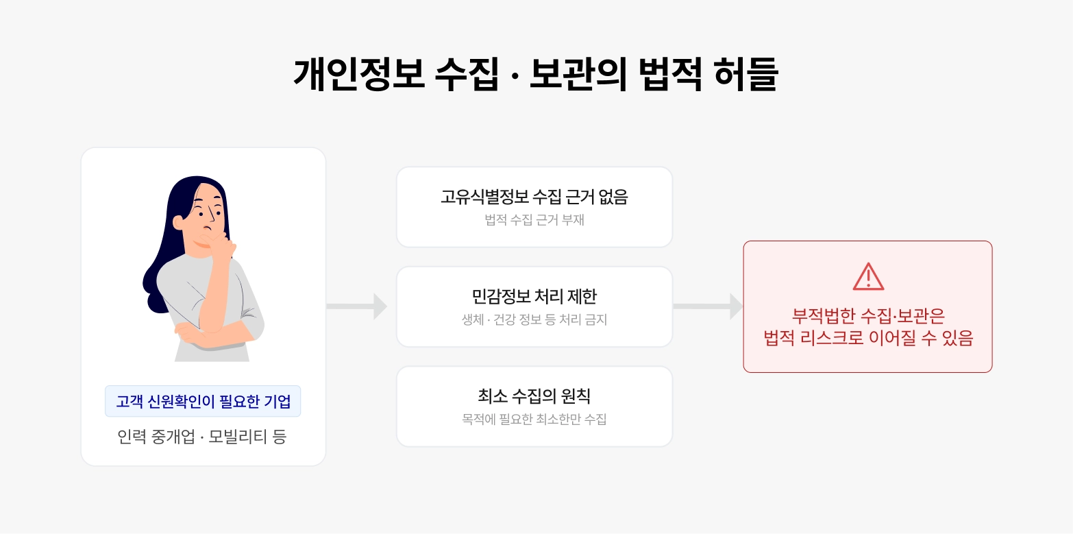 모든 기업이 고객의 민감정보를 직접 수집하고 보관할 수 있는 것은 아닙니다. 인력 중개업이나 모빌리티와 같은 일부 업종은 고객의 신원확인이 필요하지만 「개인정보 보호법」상의 '고유식별정보 및 민감정보 처리 제한'과 '최소 수집의 원칙'에 따라 고유식별정보를 수집할 법적 근거가 없습니다.