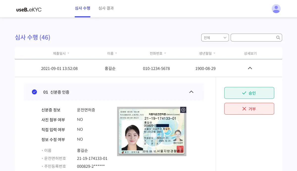 개별고객에 대한 수동심사를 진행할 수 있는 유스비 eKYC 솔루션 관리자페이지