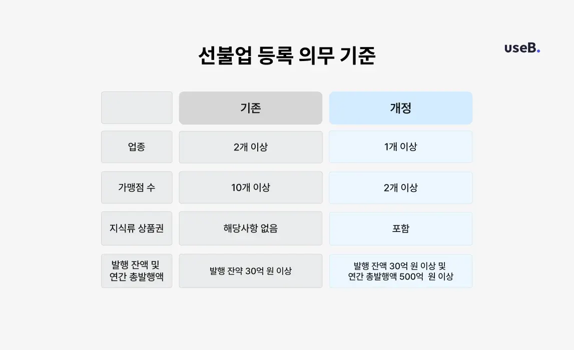 이번 전자금융거래법 시행령이 개정됨에 따라 선불업으로 등록해야 하는 대상이 확대됐습니다. 기존에는 업종 2개 이상이거나 가맹점 수가 일 때만 선불업으로 등록하면 됐지만, 개정안에서는 업종 1개 이상, , 지류식 상품권을 포함하는 경우에도 선불업으로 등록해야 하죠