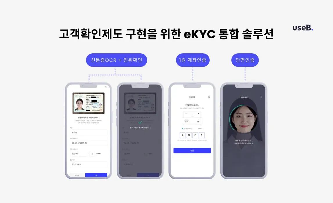 레그테크(RegTec) 전문기업 유스비(useB)는 한 번의 연동으로 신분증 OCR 및 진위 확인, 1원 계좌 인증, 안면 인증 등 다양한 인증 방식을 지원하는 eKYC 통합 솔루션을 제공해요.