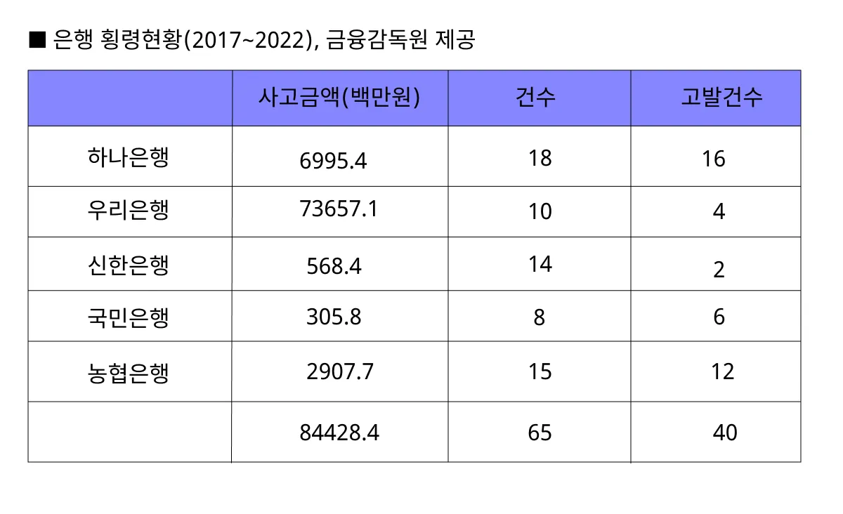금융감독원이 제공한 ‘은행횡령사고 현황(2017~2022년)’ 자료에 따르면 횡령 사고에 대한 법적 조치도 미비한 것으로 분석이 되는데요. 하나은행은 18건 중 16건, 국민은행은 8건 중 6건을, 농협은행은 15건 중 12건을 고발했으나 우리은행은 10건 중 4건을, 신한은행은 14건 중 2건만을 고발해 법적 조치가 미비한 것을 확인할 수 있습니다.