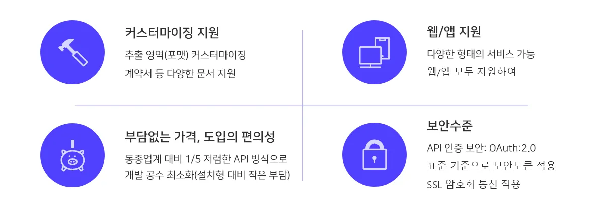 신분증, 사업자등록증과 같이 고객사가 원하는 문서 양식에 맞는 OCR 기능을 제공하며 높은 보안성능과 다양한 구현사례를 강점으로 많은 기업들의 문의가 이어지고 있습니다.