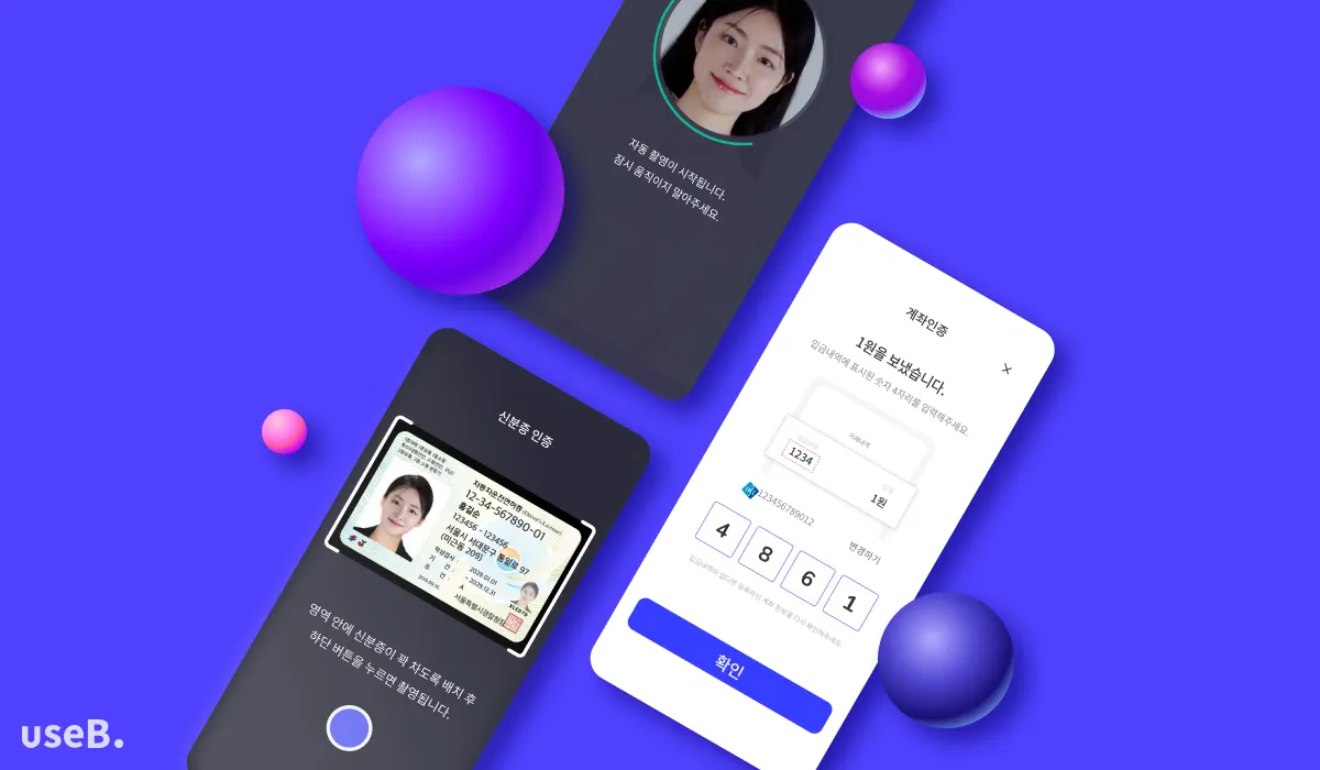 useB.(유스비) eKYC 솔루션을 이용하시면 한 번의 연동으로 신분증 OCR, 1원 계좌인증, 안면인증의 세 가지 비대면 본인인증 기능과 신뢰성 있는 UIUX를 모두 구현하실 수 있습니다.