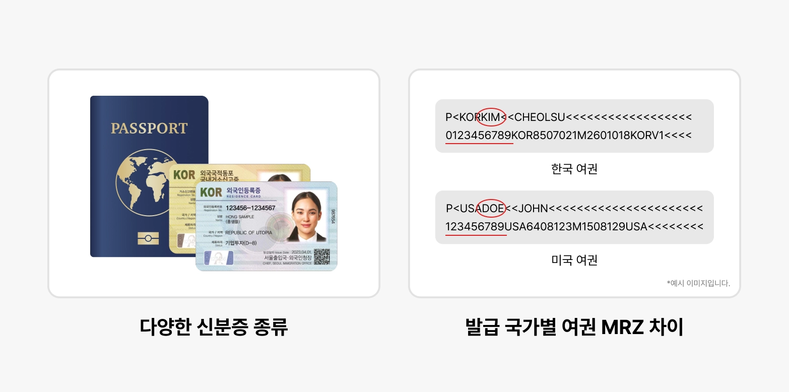 국가마다 제각각인 신분증 포맷, 여권 하단의 MRZ(기계판독영역), 국내 발급 외국인등록증의 구조적 차이는 내국인 중심의 단일 OCR 엔진으로는 정확히 판독하기 어렵습니다.