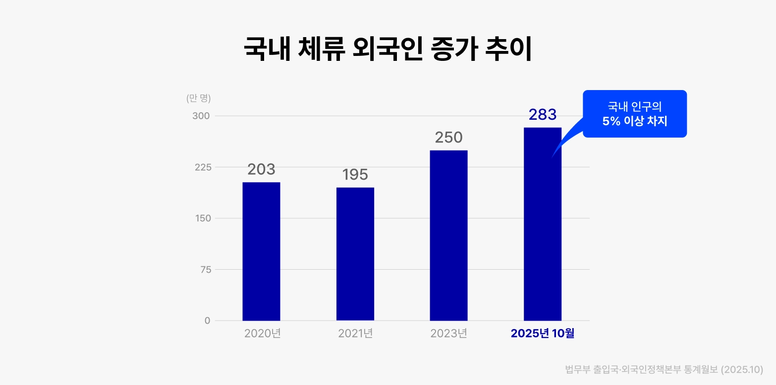 법무부 출입국·외국인정책 통계에 따르면, 2025년 말 기준 국내 체류 외국인은 약 283만 명으로 국내 전체 인구의 5%를 넘어섰습니다. 이 중 장기 체류 외국인 역시 처음으로 216만 명을 돌파하며 취업, 유학 등 실거주 목적의 체류가 가파르게 증가하고 있습니다.