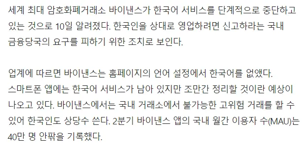 이에 따라 글로벌 거래소 바이낸스는 월간 이용자수 40만명을 기록하고 있었음데오, 한국어 서비스를 중단하게 되는 일도 있었습니다.