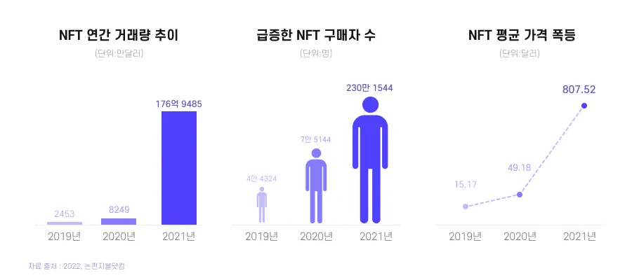 NFT 연간 거래량과 구매자 수는 나날이 증가하고 있으며 이미 우리는 사람들이 NFT를 ‘돈벌이 수단’, ‘투자의 대상’으로 간주하고 있다는 사실을 다양한 언론보도, 콘텐츠 들을 통해 체감하고 있습니다.