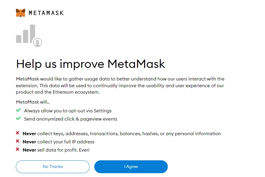 메타마스크는 절대로 키, 주소, 거래내역, 잔액, 해시 또는 개인 정보를 수집하지 않을 것입니다.