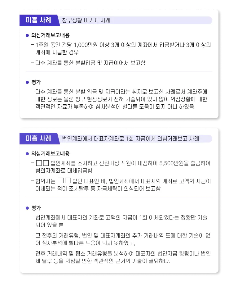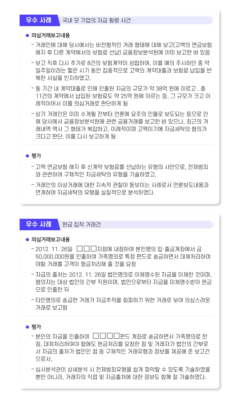 따라서 판단주체는 세심한 관찰력과 함께 꾸준히 개인의 판단 능력을 업그레이드 해야합니다. 또한 관련 금융기업에서도 그들에게 충분한 교육과 STR가이드라인 등을 제공하여 함께 발전해나가는 것이 요구됩니다.