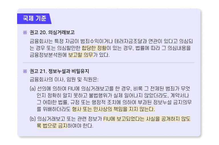 STR의 국제적 기준은 FATF(자금세탁방지 금융대책기구, Financial Action Task Force)의 개정 40개 권고사항에 다음과 같이 제시되어있습니다.